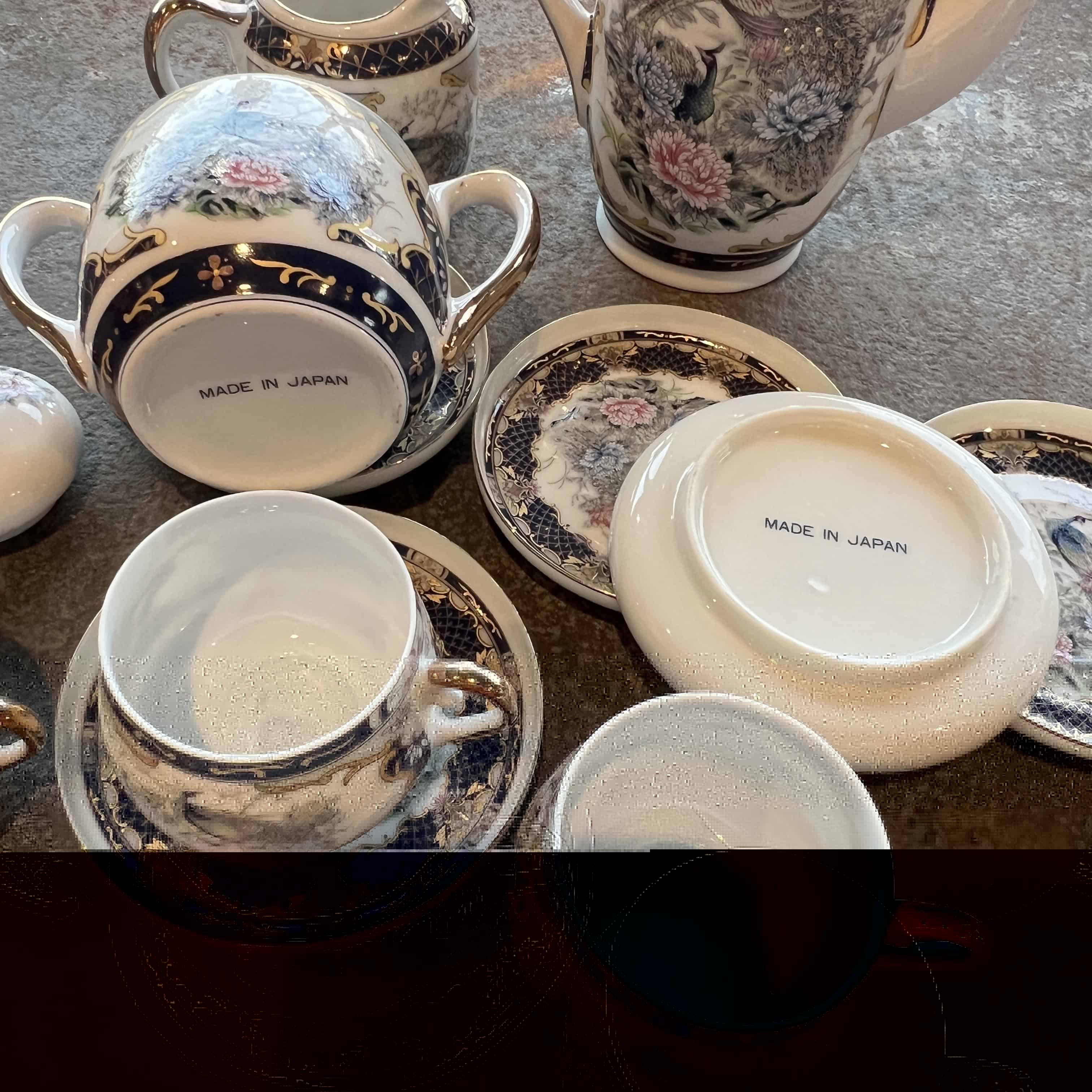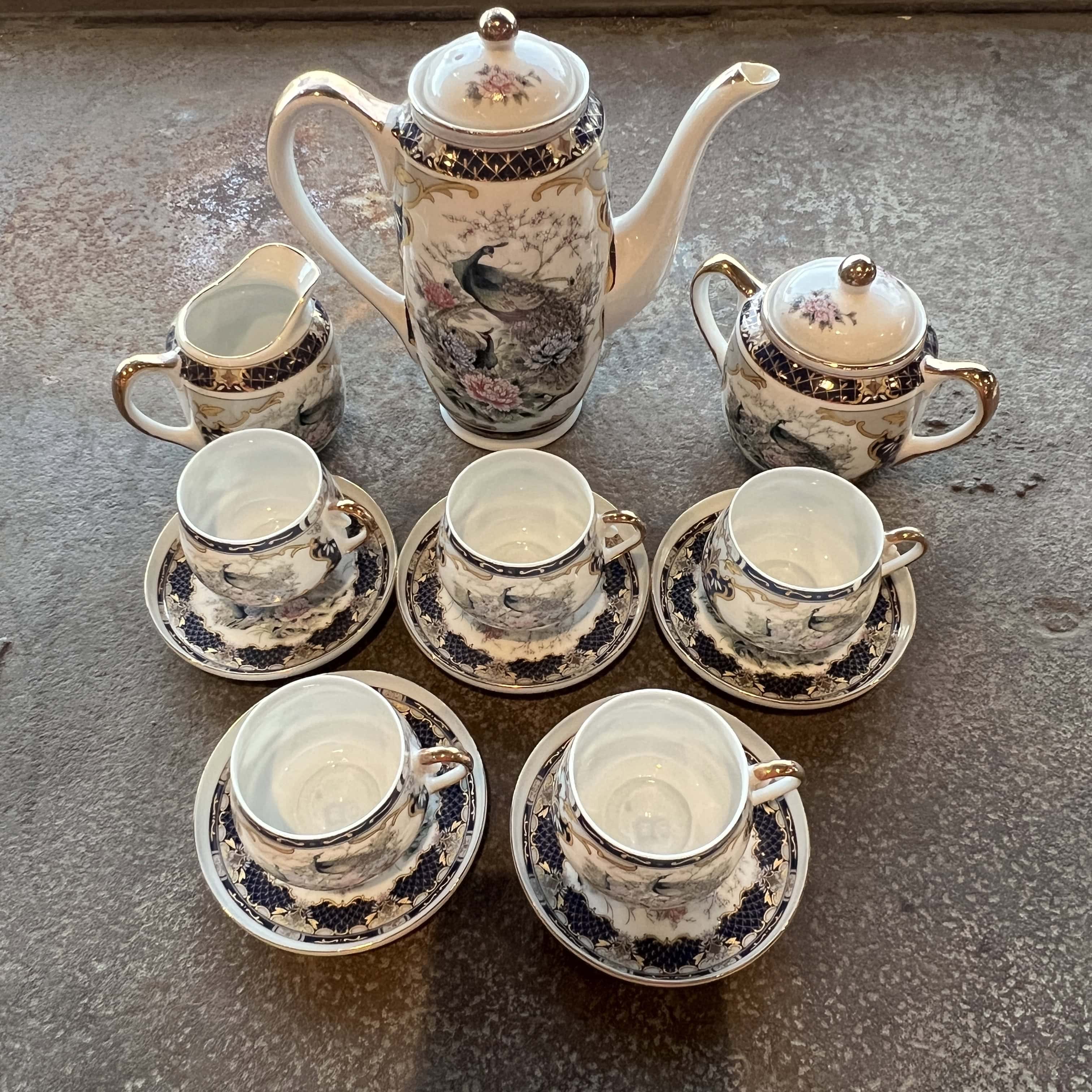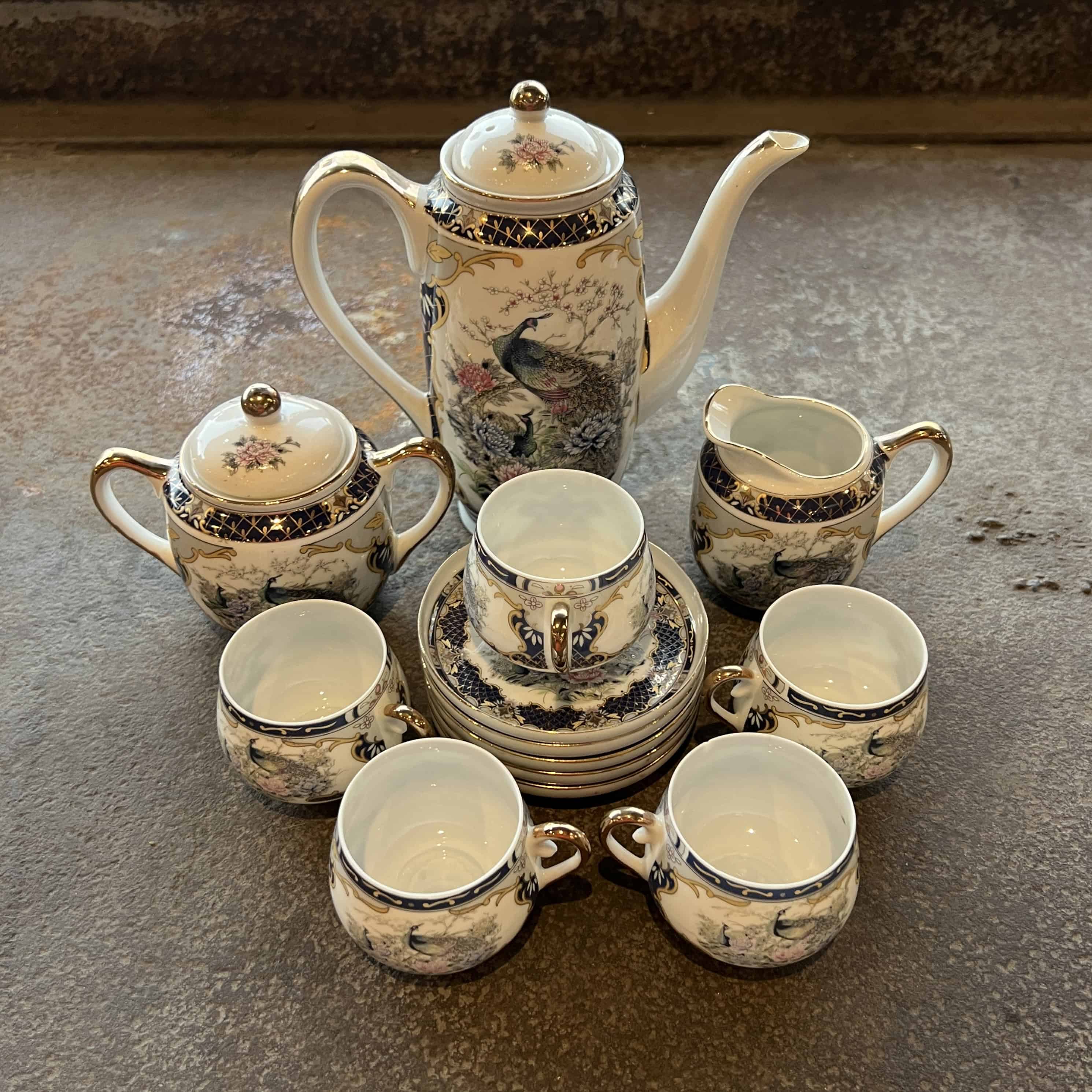 Japanese Porcelain Tea Set - w/Peacock Motif with Hidden Geisha Lithophane Image in the Bottom of Five Cups (small chip on one cup see photo)