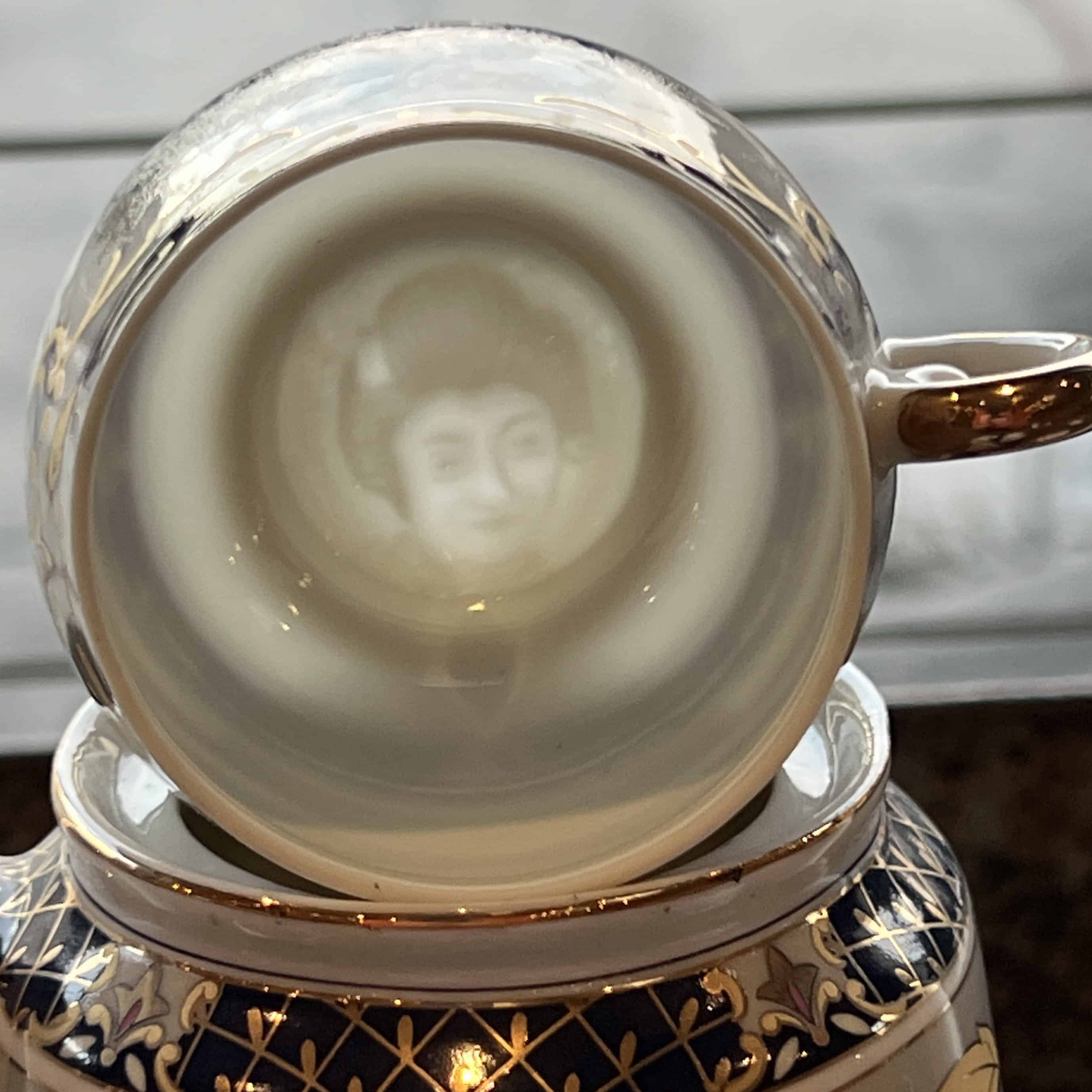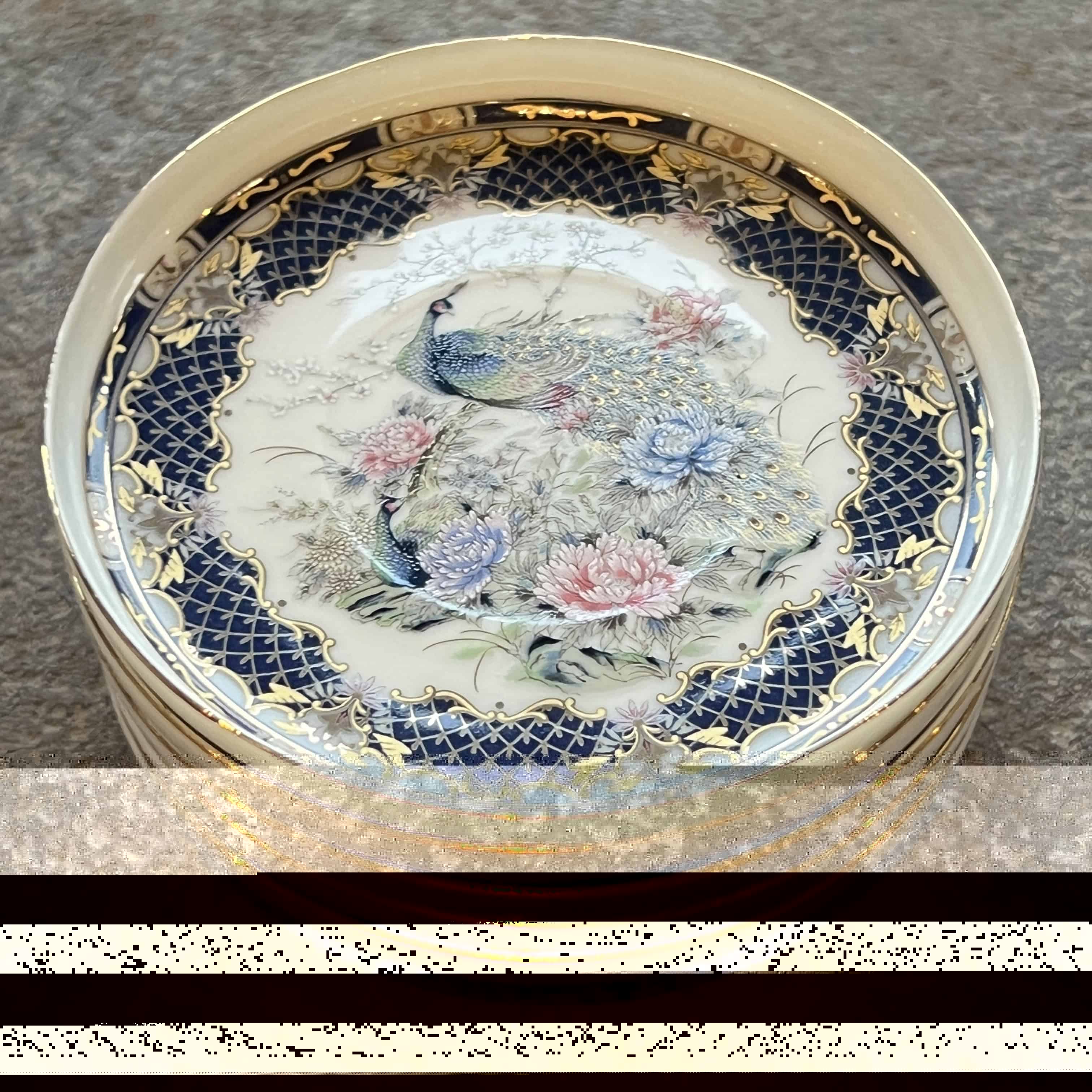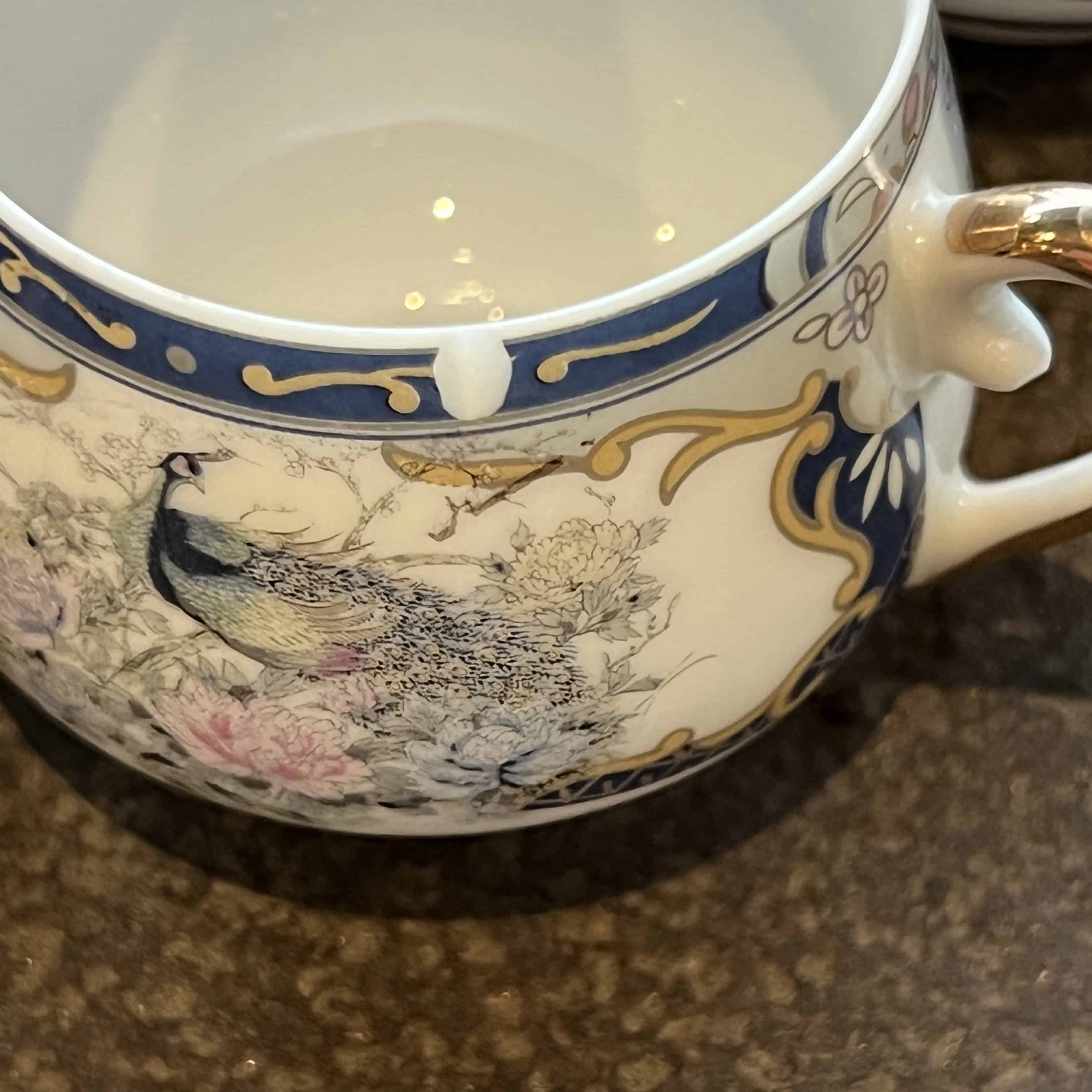 Japanese Porcelain Tea Set - w/Peacock Motif with Hidden Geisha Lithophane Image in the Bottom of Five Cups (small chip on one cup see photo)