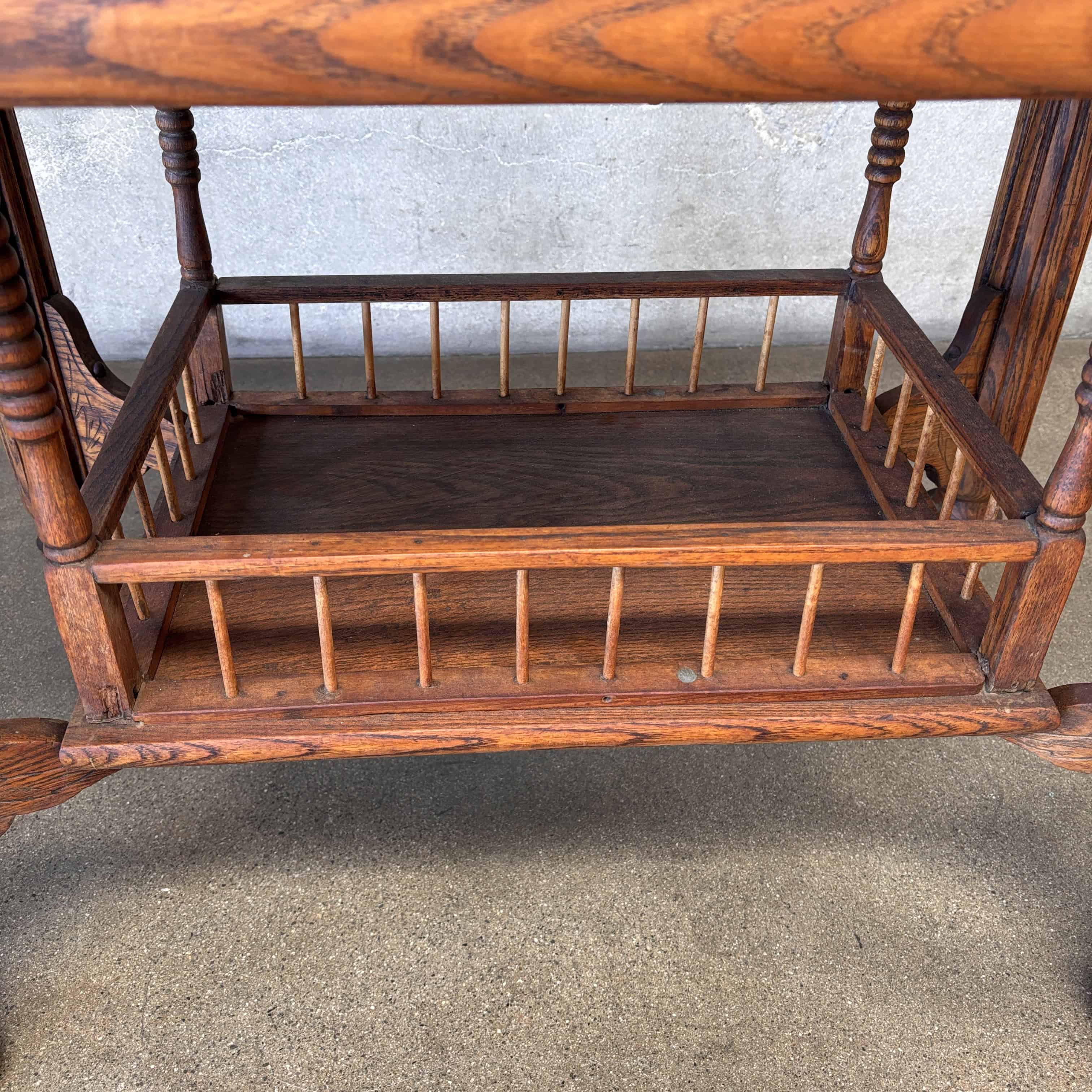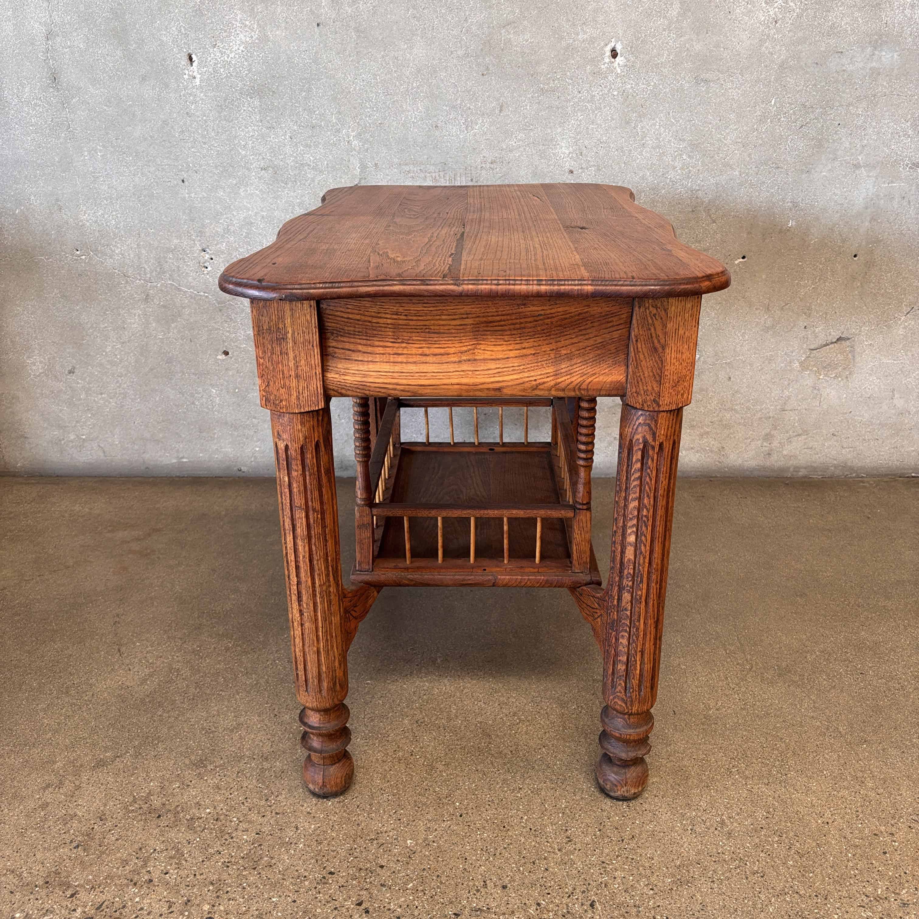 We have a beautiful late-Victorian American Oak work / library table. The lower slatted shelf has a spindle gallery (added for utility) that would hold book/ledgers, sewing baskets, sheet music, etc. It has turned legs with chamfered feet. There are no splits to the wood or repairs.